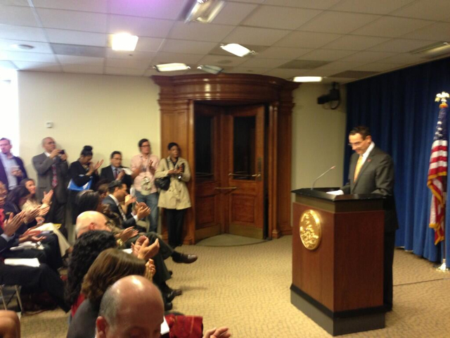 Mayor Vince Gray formally introduced a bill this afternoon that would offer driver’s licenses to all D.C. residents, regardless of immigration status. At a press conference at the John A. Wilson Building, Gray and members of the D.C. Council received multiple rounds of applause of a briefing room packed with immigration and labor activists.
