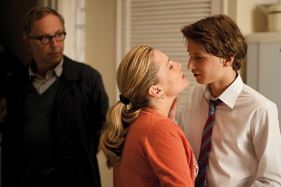 Fabrice Luchini, Emmanuelle Seigner, and Ernst Umhauer (Cohen Media)Teenage writing student Claude (Ernst Unhauer) attracts the scholarly interest of uninspired high school teacher Germain (Fabrice Luchini). Germain shows the prodigy’s writing exercises to his wife Jeanne (Kristin Scott-Thomas), who runs a contemporary art gallery, and the pair of elders become wrapped up in Claude’s supposedly non-fiction pieces like a soap opera. Director François Ozon has done well in this twisted thriller territory before in superior entertainments like Swimming Pool and Under the Sand. In the House has an intriguing premise but the tension is deflated by parody — of contemporary art, of Woody Allen — which takes the movie farther and farther away from what could have been a provocative work about the nature of good writing. But maybe its ultimate failure means Ozon has the last laugh: a script that tutors its young charge in the elements of plotting never corrects its own mistakes.