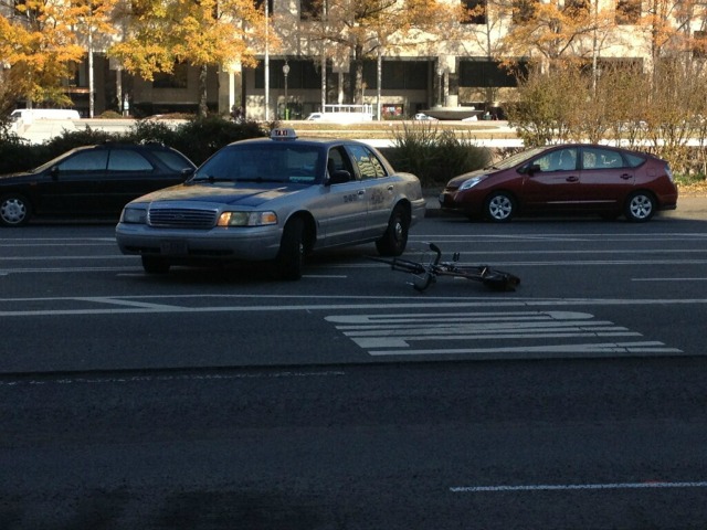 A cyclist was hit by a taxicab making a U-turn on Pennsylvania Avenue this morning in front of the Wilson Building.