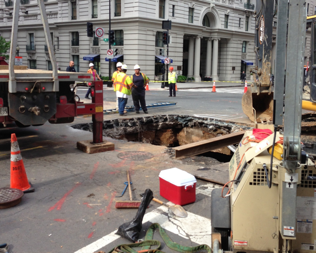 The news for commuters isn’t getting any better tonight. The sinkhole that opened yesterday at the intersection of 14th and F streets NW continues to be a gaping pit in the middle of two major downtown arteries, while workers from DC Water continue to repair the damage and figure out just why the street caved in.