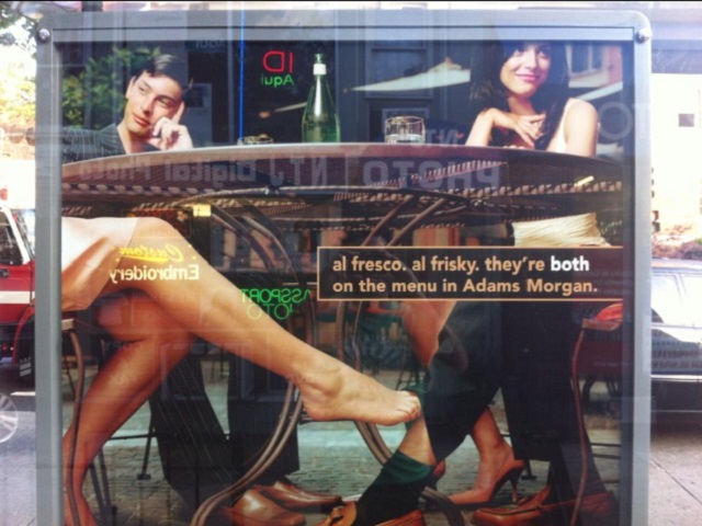 The ad from the Adams Morgan Partnership Business Improvement District shows a woman’s shoeless foot touching a man’s leg under a table behind text reading, “Al fresco. Al frisky. They’re both on the menu in Adams Morgan.”