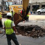 The sinkhole was created by a broken storm drain that also caused a second rupture in the normally busy intersection. Workers repairing the broken drain and eventually filling in the sinkhole have had their work complicated by various factors, including the presence of old streetcar tracks a few feet down.