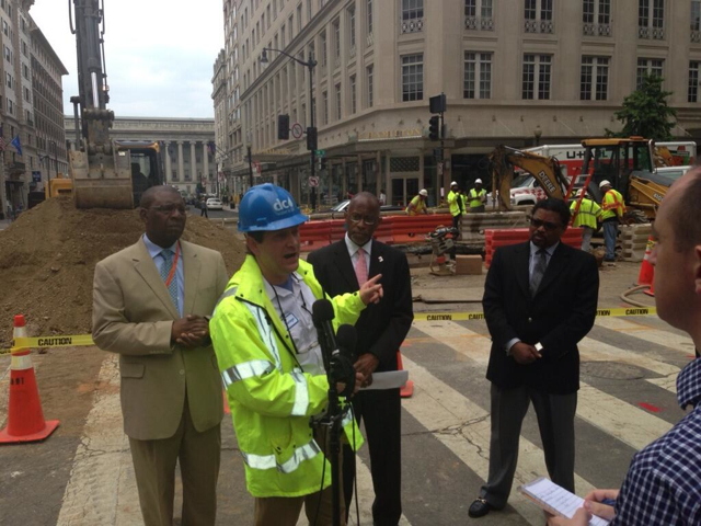 DC Water General Manager George Hawkins, center, addresses reporters about sinkhole repairs. (Photo via DC Water)