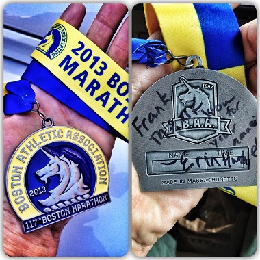 Hurley’s medal. Photo courtesy Frank Fumich.The men were joined for the last 19 miles of the trip by Erin Hurley, the girlfriend of Bauman, who lost both of his legs in the bombing. A photograph of Bauman’s rescue by a man in a cowboy hat remains one of the most searing images from the bombing.