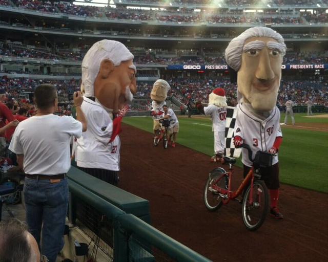 The Washington Nationals’ nightly “Racing Presidents” sideshow featured something of a multi-modal twist last night. Instead of trotting around on foot, the mascot versions of presidents George Washington, Thomas Jefferson, Abraham Lincoln, Theodore Roosevelt, and William Howard Taft raced around the warning track on Capital Bikeshare rides.