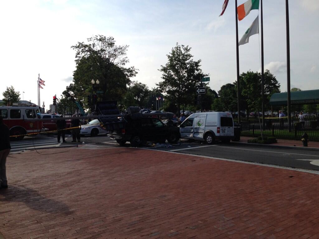 Six people have been transported to local hospitals, according to Officer Araz Alali, a spokesman for the Metropolitan Police Department. Two of the pedestrians are in very serious condition, Alali says. A spokesman for D.C. Fire and Emergency Medical Services says there is no indication as to the severity of the injuries sustained by the others, including two occupants of one vehicle that was involved in the collision and one occupant of the other.