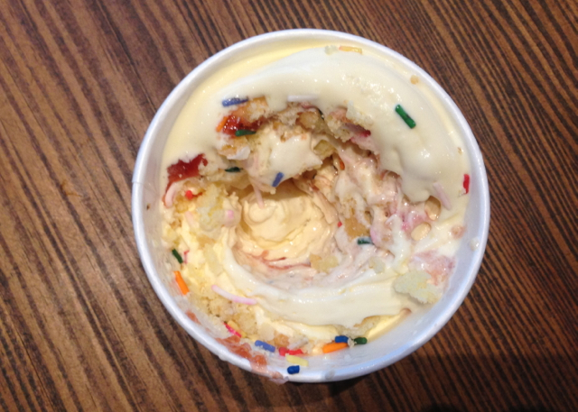 The dessert mixes Shake Shack’s standard vanilla custard with rainbow sprinkles, raspberry jam, and chunks of coconut-crusted doughnuts baked by nearby Astro Doughnuts & Fried Chicken. And yes, it is as satisfying as it is ridiculous.