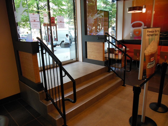 “The Dunkin’ Donuts restaurant on K Street is currently wheelchair accessible through the lobby of the building,” Lindsay Harrington, a public relations manager for the doughnut chain, said in an email. “The franchisee will improve the signage to provide better directions to people using wheelchairs. Additionally, the franchisee is exploring opportunities to modify the restaurant to improve access to people at the front door of the restaurant in the future.”