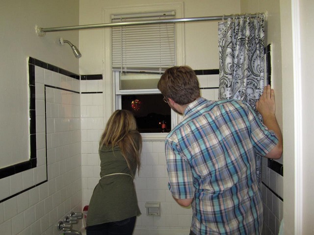 The author’s friends watch the fireworks from her bathtub. Photo by Sarah Anne Hughes.