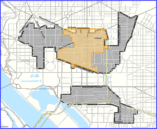UPDATE, 5 p.m.: Tregoning adds that the elimination of parking minimums will still apply to downtown D.C., the definition of which is being expanded according to a map she sent to DCist. The area colored in orange is what current zoning laws consider to be “downtown,” but when Tregoning’s office submits its report to the zoning commission, downtown will be expanded outward to include the entire shaded area, which stretches from Dupont Circle to NoMa. The map also includes a southern swath of the city encompassing Southwest Waterfront and Navy Yard.