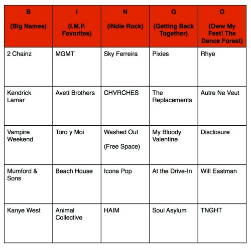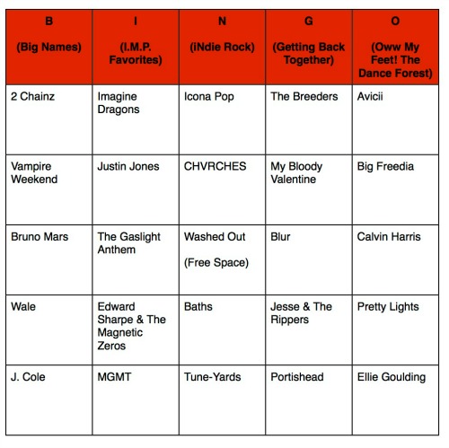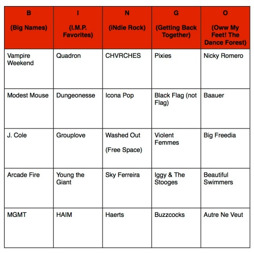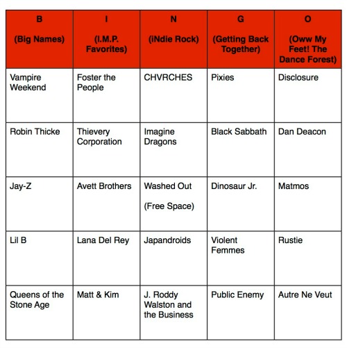 With all of this in mind, the DCist staffers decided to have fun with our lineup predictions by making BINGO cards. B takes care of our Big Name acts like Skrillex, Jack White, and Weezer. Under I we put down acts that have a good established relationship with I.M.P. like The National and The Hold Steady. Under N, we put iNdie acts. Yeah, it’s a stretch, but it also allows Washed Out, the one act we’re pretty sure to be playing the festival, to occupy our free space. For G we have acts that are Getting Back Together, or in the case of artists like Patti Smith and Joan Jett—touring again. O in this case stands for “Oww, My Feet!” which is how we feel after spending too much time at the Dance Forest. We’ll take a look at these cards after a lineup has been confirmed to see how we did.