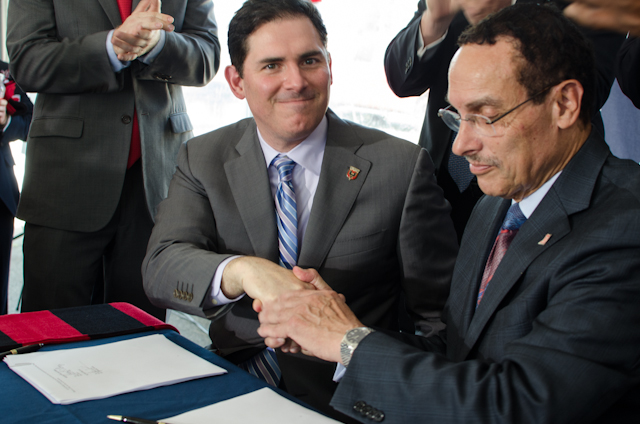 United co-owner Jason Levien, center, and Mayor Vince Gray sign the term sheet for the stadium deal. (Photo by Pablo Maurer)