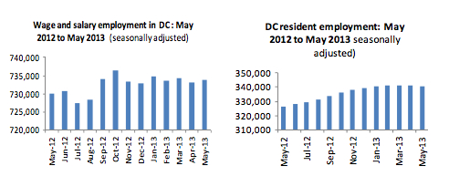 Jobs in D.C., for residents and nonresidents alike, topped out in October 2012 at 736,400. But in May 2013, the most recent month for which data are available, that figure dropped 0.4 percent to 733,800. Over the previous 42 months, the District added about 41,200 jobs, or nearly 6 percent.