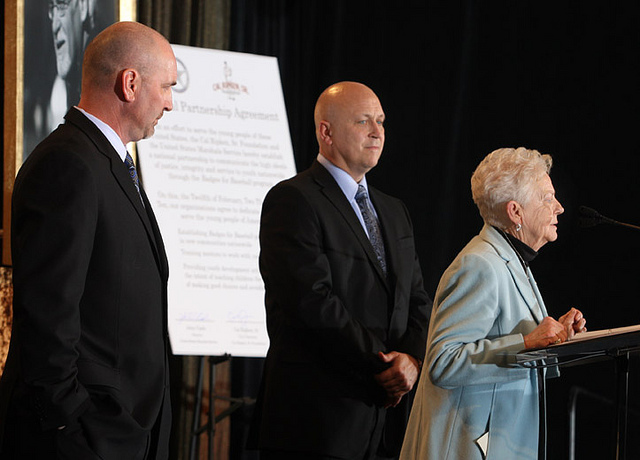 Vi Ripken in February 2010 with son Cal Ripken Jr., center. (Photo by Maroon PR)