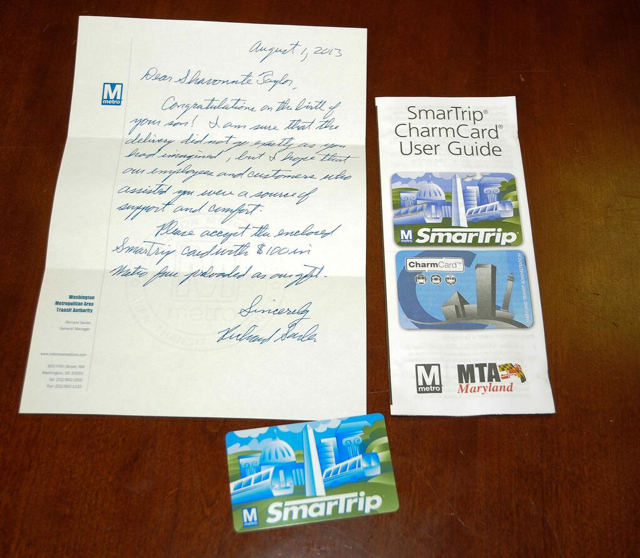 “I am sure that the delivery did not go exactly as you imagined, but I hope that our employees and our customers who assisted you were a source of support and comfort,” Sarles wrote in his note to Taylor, which came with a $100 SmarTrip card.
