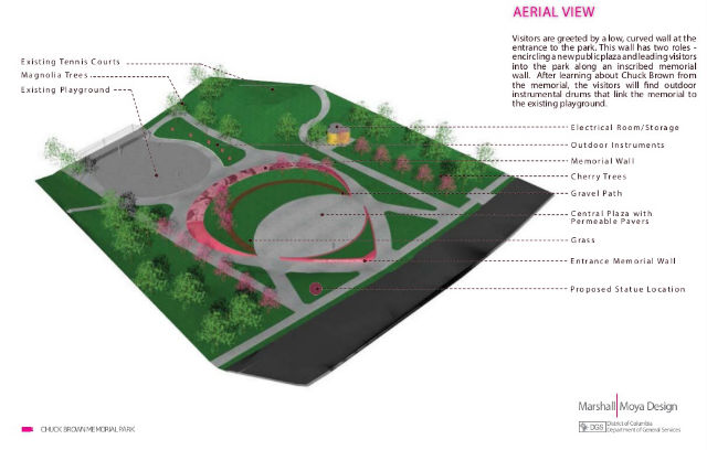 The big news from the meeting came from the [Department of General Services] and [Department of Parks and Recreation] presenters who said the concept of the Chuck Brown memorial as an amphitheater has been scraped and the memorial will now be a plaza. When this was announced, the meeting broke out in applause! The current designs include a statue and information about Chuck Brown’s life and legacy. They call for a human-scale wall that will include his discography and images. Both designs also included a statue of Chuck Brown, which would require a different process, but one they expect to include.