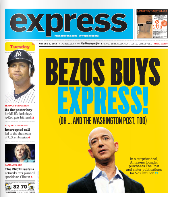 Bezos is also taking control of The Gazette Newspapers, Southern Maryland Newspapers, Fairfax County Times, El Tiempo Latino, Greater Washington Publishing, and, perhaps most visibly, the Express free daily tabloid that the Post shoves on Metro riders every morning. And just how did Express play the big transaction?
