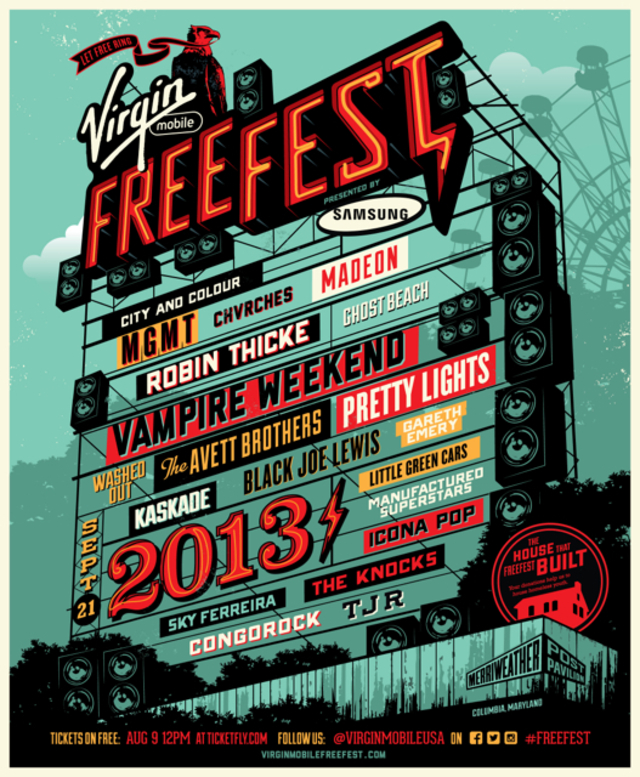 And if you didn’t manage to snag a free pass to see Robin Thicke, Vampire Weekend, The Avett Brothers, Pretty Lights, MGMT, and more, fear not! You can still snag a FreeFest ‘Freemium’ Package for the very not-free price of $49.50. That package includes a general admission ticket and a $10 donation to RE*Generation, Virgin Mobile’s youth homeless charity. The whole thing goes down September 21 at Merriweather Post Pavilion.