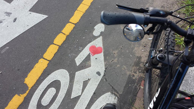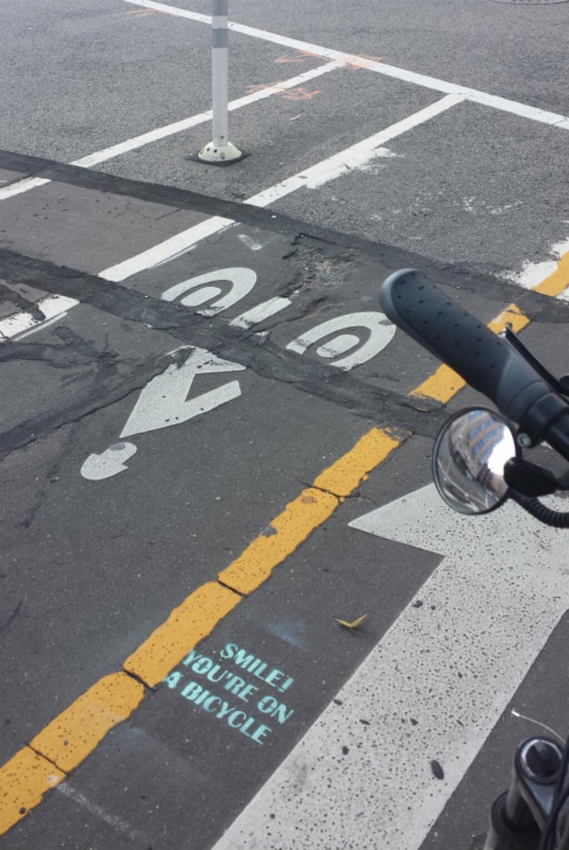 “Smile, you’re on a bicycle.” This is just one message that has been painted on the 15th Street cycle track by a mystery graffiti-doer to greet passing cyclists.