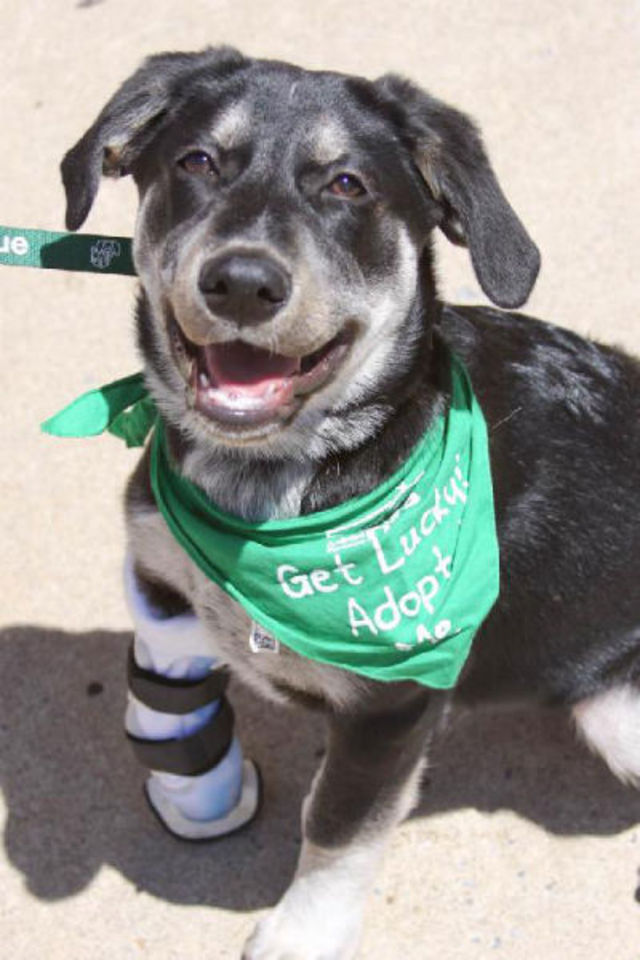 Evan, along with many other dogs, is currently up for adoption. The person who adopts Evan will be able to get a discount from the veterinarian Lucky Dog uses when Evan needs a new prosthetic.