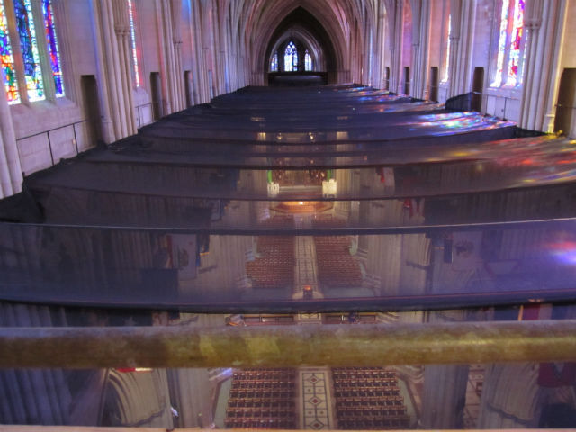 The earthquake did about $26 million in damage to the historic Cathedral, Andrew Hullinger, senior director of finance and administration, told a group of reporters standing on construction scaffolding dubbed the “dance floor” 60 feet above the worship area. Thus far, $10 million has been raised for repairs, leaving about 60 percent of the funding still unaccounted for. According to Hullinger, $3 million has been spent so far.