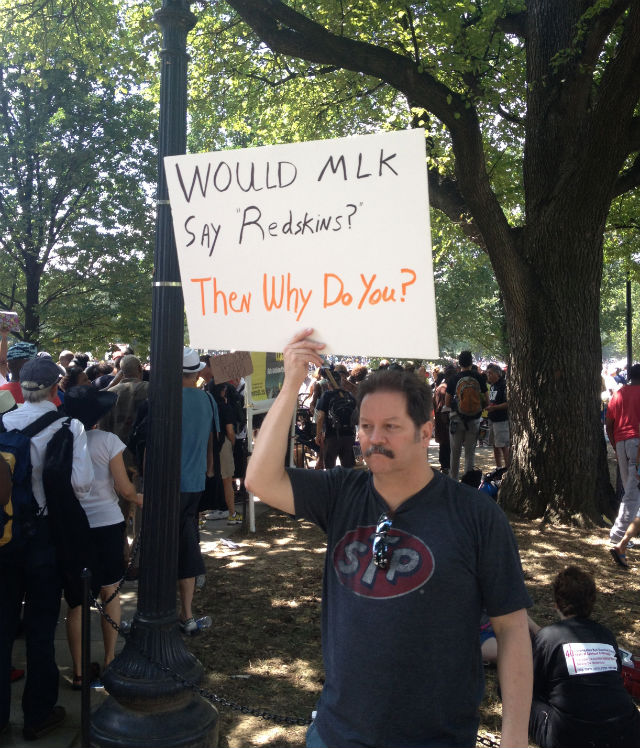 Matthew Murguia, an area resident for 28 years, told DCist contributor Sriram Gopal that he chose the to protest the name at the Realize the Dream March and Rally because “It’s a huge crowd that understands the value of words and the hurt words can cause.”