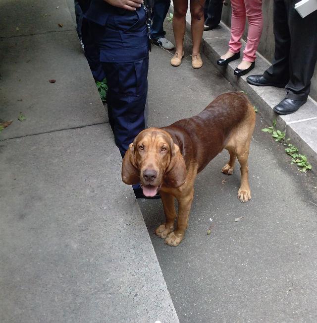 To demonstrate Sam’s abilities, Lanier hid herself in a courtyard at the MPD headquarters. With the scent of her shirt, the bloodhound was able to quickly locate Lanier, who was near a bush and a dead bird.