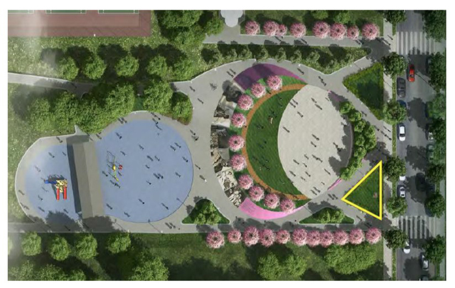 The yellow triangle is where the installation will go. Rendering via Commission on the Arts and Humanities.