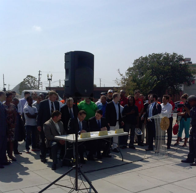 On an absolutely disgusting September day, in front of a crowd of sweating reporters and unionized construction workers, Mayor Vincent Gray, D.C. United co-owner Jason Levien and labor leaders signed a project labor agreement for the planned soccer stadium at Buzzard Point.