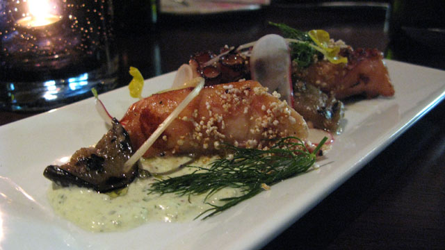 Charred octopus with green harissa and eggplant at Kapnos.