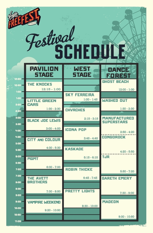 As it is with FreeFest every year, there are multiple stages. And with multiple stages at any festival, you will have choices. Luckily, Virgin Mobile just released the schedule for Saturday, so you have three days to pour over that schedule and figure out who you’re going to see.