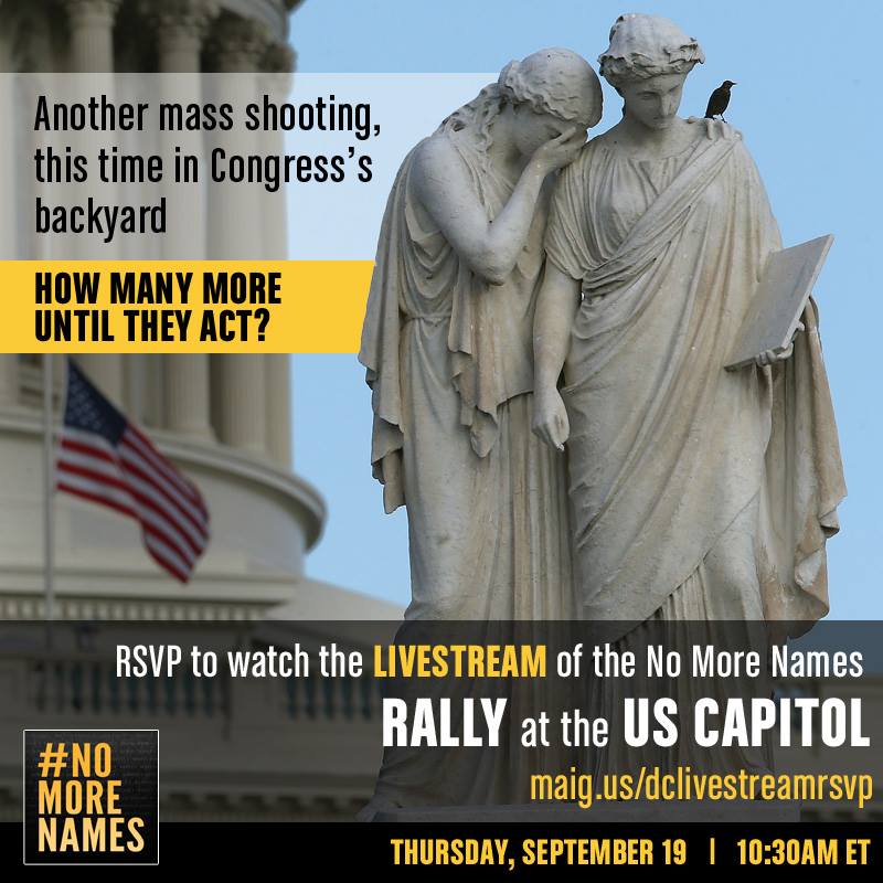 The group says they’re “bringing the call for common sense gun laws directly to the Capitol” with what will be one of their “biggest events yet.” The No More Names bus has been on tour all summer, organizing similar rallies in twenty-five states that featured gun violence survivors and others speaking out to urge members of Congress to change the nation’s gun control laws.