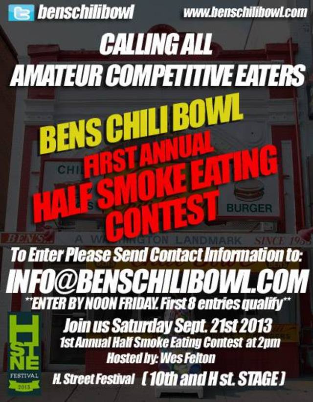 Half-smoke aficionados take heed: Just as Taylor Charles Steak & Ice is having a five-minute Italian water ice eating contest this weekend, Ben’s Chili Bowl will be hosting their own competition. The first annual half-smoke eating contest will take place on Saturday during the H Street Festival festivities. As Ben’s will open its second location on H St. next year, I guess this is their way of breaking into the neighborhood.