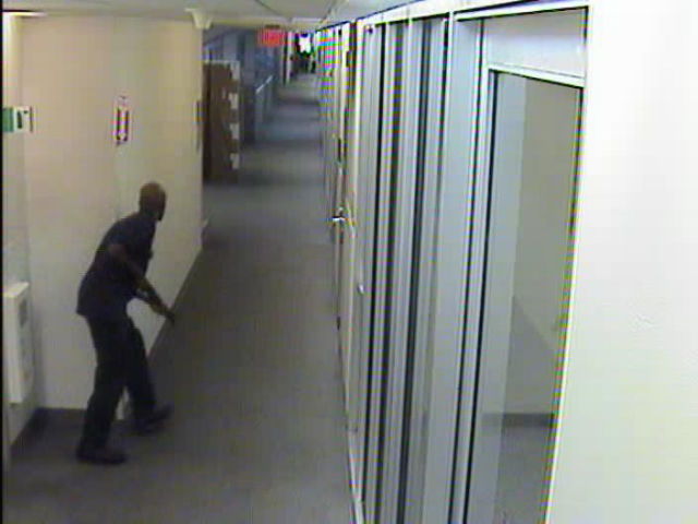 Alexis moves through the hallways of Building #197 carrying the Remington 870 shotgun. Courtesy FBI.