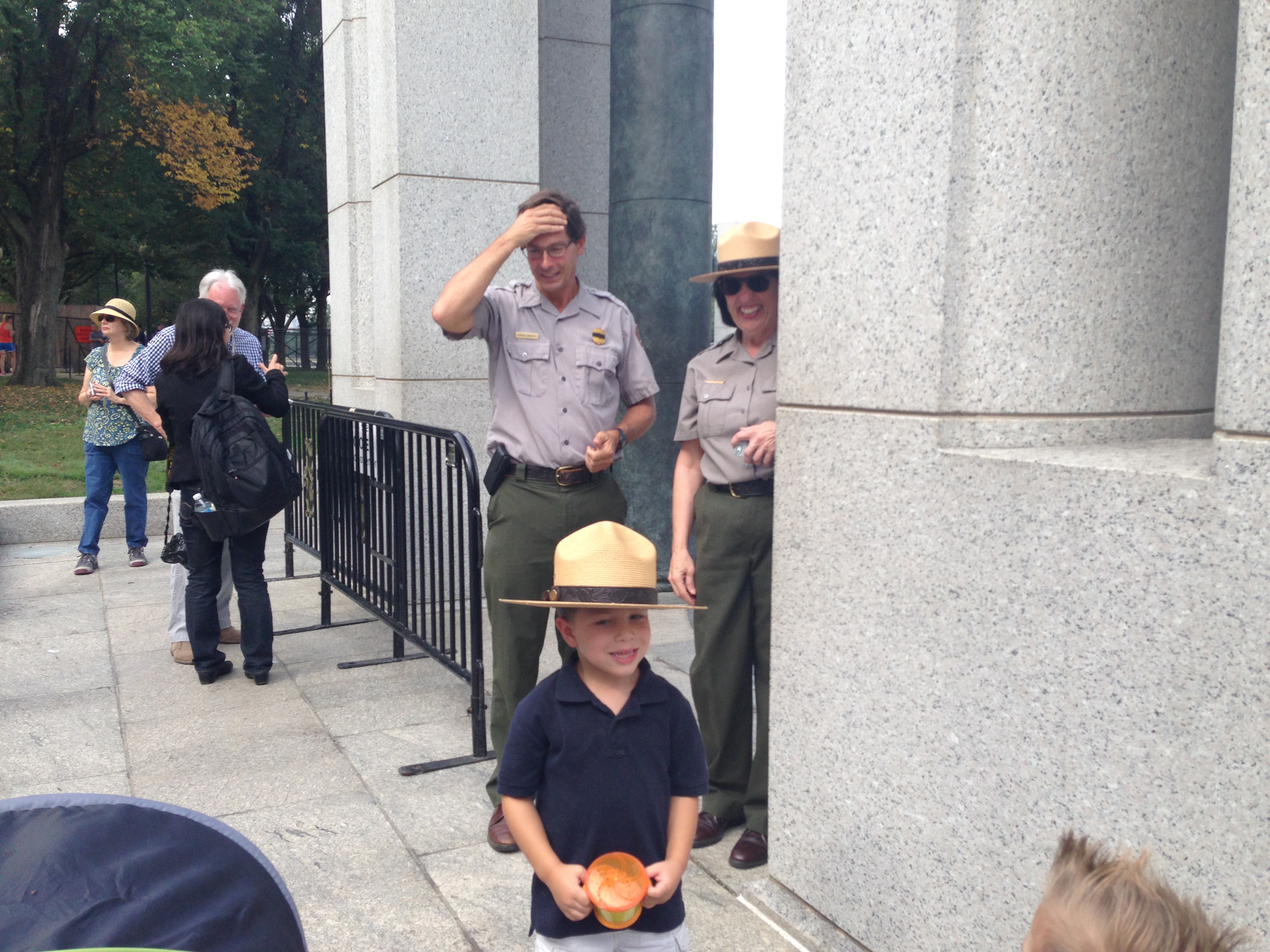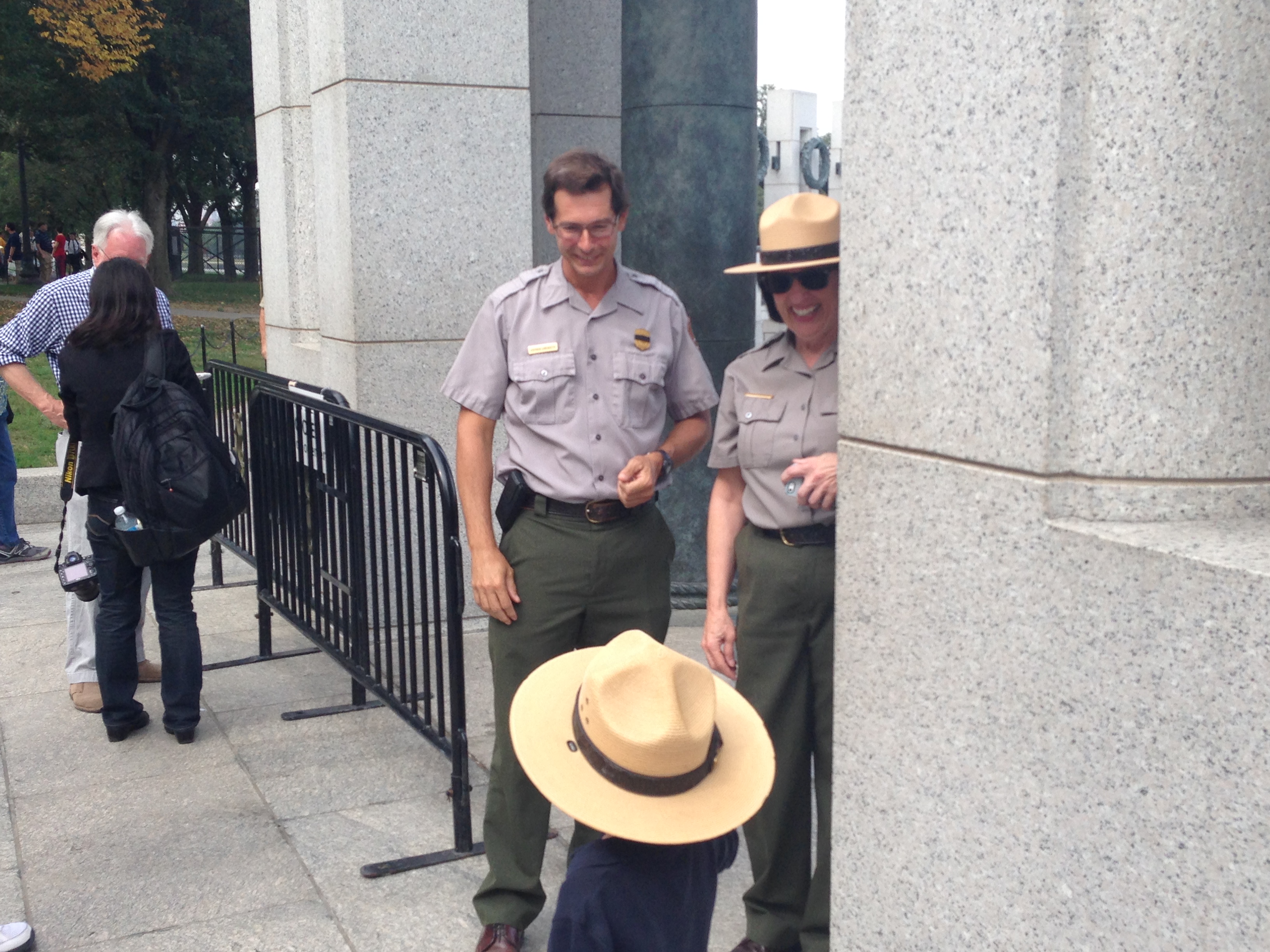 Meanwhile, the U.S. Park Service Rangers are still out there, hard at work being big ‘ol jerks, doing things like letting families at the WWII Memorial take cute pictures of their kids wearing Park Service Ranger hats, as DCist reader Matt Rollins tells us.