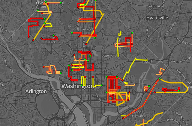 Casey Trees has created a map of color-coded routes, showing where to see the changing leaves on red and sugar maples, ginkgo bilobas, pin oaks and American elms. Each description shows the length of the route, how many trees are on the route and what colors you should expect to see. From Casey Trees: