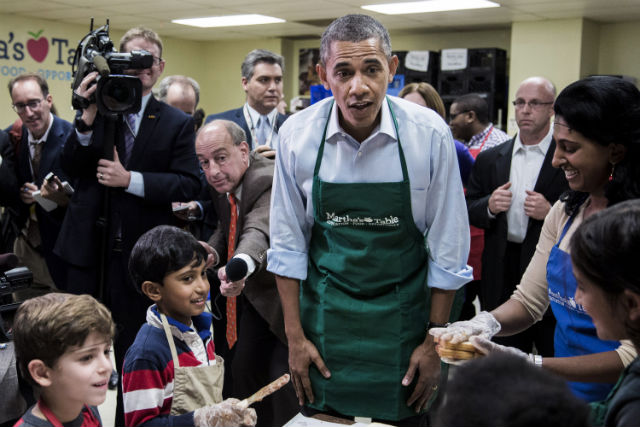 President Barack Obama visits with furloughed federal workers volunteering at a Martha’s Table kitchen on October 14. (Photo by T.J. Kirkpatrick-Pool/Getty Images)