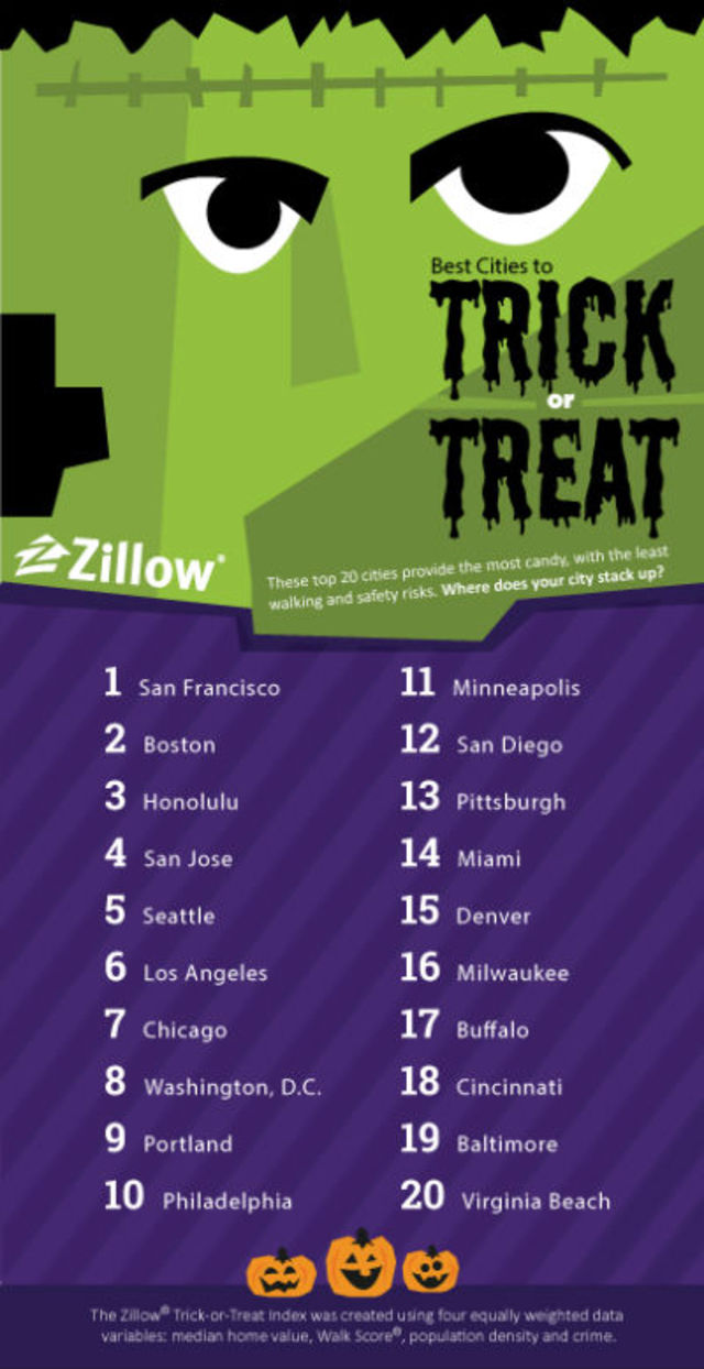 Zillow takes numbers seriously, even when it comes to trick or treating. Taking the most holistic approach, the Trick-or-Treat Index is calculated using four equally weighted data variables: Zillow Home Value Index, population density, Walk Score and local crime data from Relocation Essentials. Based on these variables, the Index represents cities that will provide the most candy, with the fewest walking and safety risks.