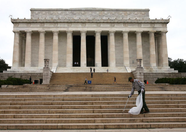 A U.S. Park Service worker picks up trash in front of the Lincoln memorial on the morning after a bipartisan bill was passed by the House and the Senate to reopened the government and raise the debt limit. (Photo by Mark Wilson/Getty Images)