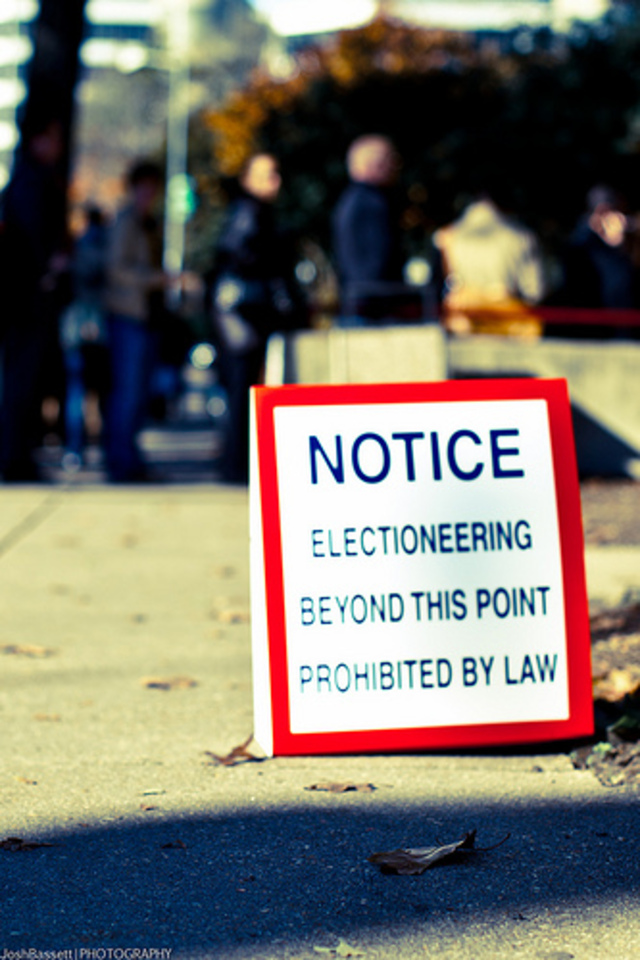 Campaign helpers are standing the typical distance from the door handing out flyers, candidate info, etc.