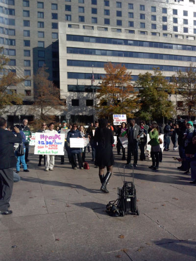 Inocencio Quinones of jobs group Our D.C. said this is a universal issue. He told the crowd that companies use “economic profiling” to treat minimum wage workers anyway they please: “As long as I wake up in the morning, I’m going to make sure they know that’s not right.”