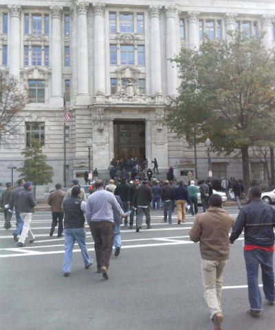 Cab drivers walk to the Wilson Building. Photo by Sarah Anne HughesOf the over 8,500 cab drivers* in D.C., more than 1,800 have joined the Teamster-Taxi association, according to a release from the group.