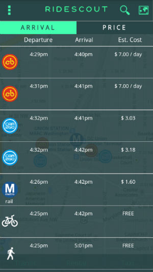 Available for both iOS and Android, the app pieces together information from Metro, other public transportation networks, Car2Go, SideCar, taxi-hailing app Hailo and Capital Bikeshare. Notably not included is Uber, which doesn’t shares its information with any other sites. RideScout spokeswoman Rachel Charlesworth said they are “continually looking to bring on new partners,” and are asking users to lobby national services like Lyft to come on as partners.
