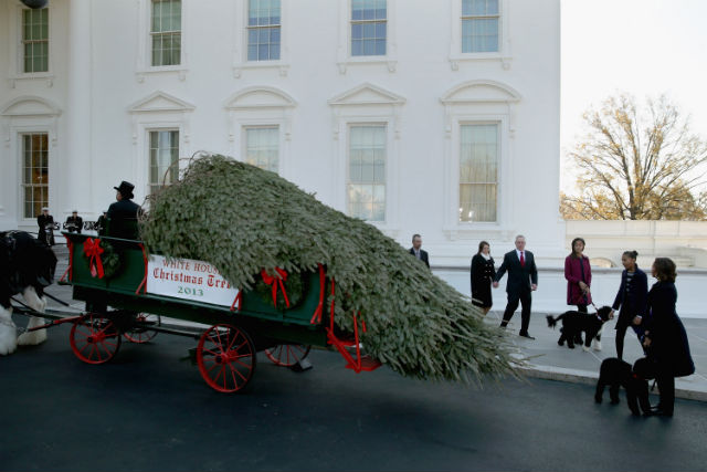 The tree arrived in the North Portico at around 11 a.m., with First Lady Michelle Obama, Malia and Sasha, Bo and Sunny, a band, and a gaggle of press on hand to welcome it. According to the White House Pool report, the tree is 18-and-a-half feet tall, and was presented by Christopher Botek and Kyra Yurko of the Christmas Spring Tree Farm in Leighton, Pa. and John and Leslie Wyckoff of the Wyckoff’s Christmas Tree Farm in Belvidere, N.J.