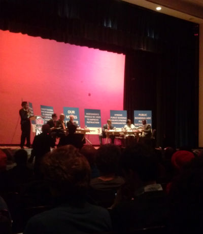 Candidates at the education forum.Mayor Vince Gray faced an angry and very vocal crowd at Monday night’s mayoral candidate forum put on by the Washington Teachers Union, his first debate since announcing his plans to seek reelection.