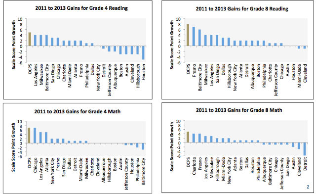 Results of the 2013 Trial Urban District Assessment show that D.C. fourth- and eighth-grade students made gains in both reading and math, with fourth grade gains over the past two years in reading at five points and math at seven points, and eighth grade gains in reading at eight points and math at five points.