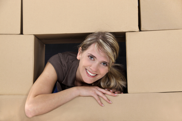 Just look how happy this woman is in her box fort. (Image via Shutterstock)