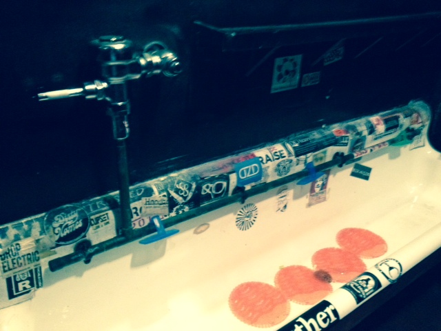 +1 for stickers, stickers, stickers: Along the trough and toilet below there are stickers for bands, record labels, you name it. I, for one, like to read while I pee (I cannot wait to review a bathroom that puts the newspaper above its stalls), and while stickers aren’t exactly informative, I’ll take what I can get. The young men who put their stickers onto the porcelain are the Hotel’s real unsung heroes.