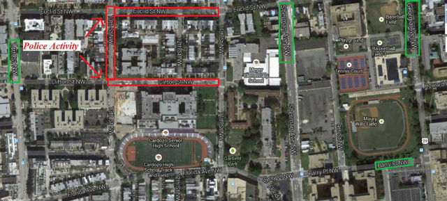 Police Activity: 1300 blk of Clifton St NW. Streets Closed:Outlined in red
