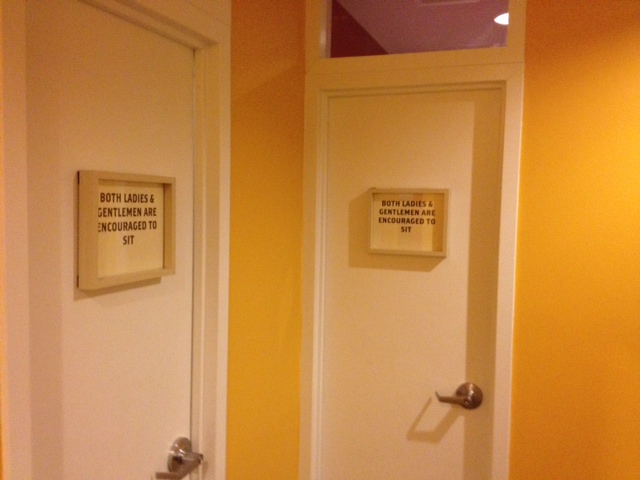 Located near the recent explosion of bars and restaurants in Shaw, Right Proper Brewing Company offers a diverse beer menu and solid food options. This is not a high-concept bar like Eat the Rich, Southern Efficiency, or Mockingbird Hall (what’s next after ham and sherry? Rabbit and sloe gin? Jerky and fortified wine?). Instead, Right Proper is a neighborhood bar with emphasis on its home brews and savory menu. Like a good neighbor, the bar’s bathroom strives to be welcoming to the entire community. Like a not-so-good neighbor, it does this in a passive-aggressive way.